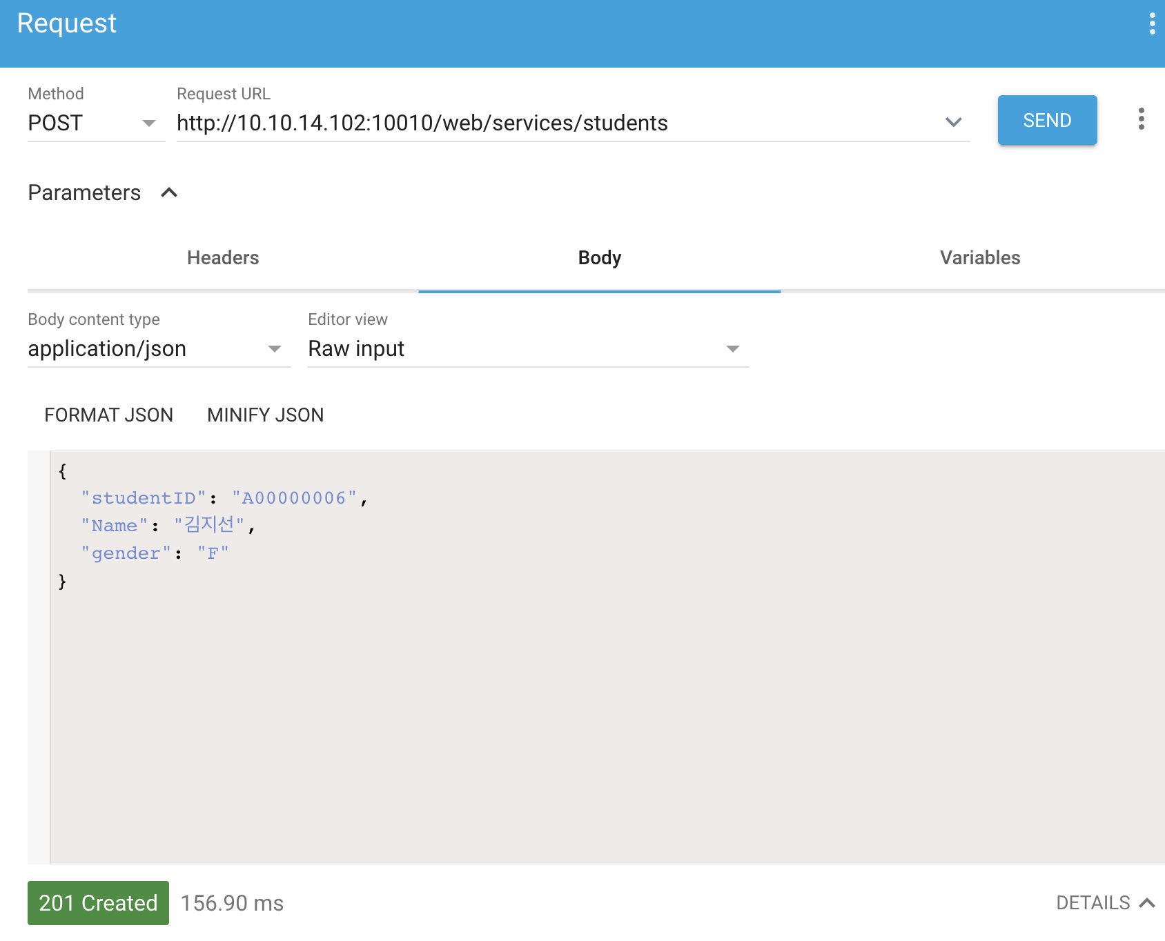 샘플 학생 정보 테이블을 사용하는 학생 정보 등록 서비스를 구현해보겠습니다. 구현할 서비스는 다음과 같습니다.
