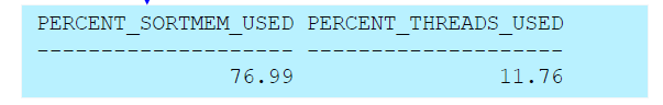 SELECT MAX(DEC((FLOAT(ALLOCMEM)/FLOAT(SHEAPTHRESSHR))*100, 5,2)) AS PERCENT_SORTMEM_USED,