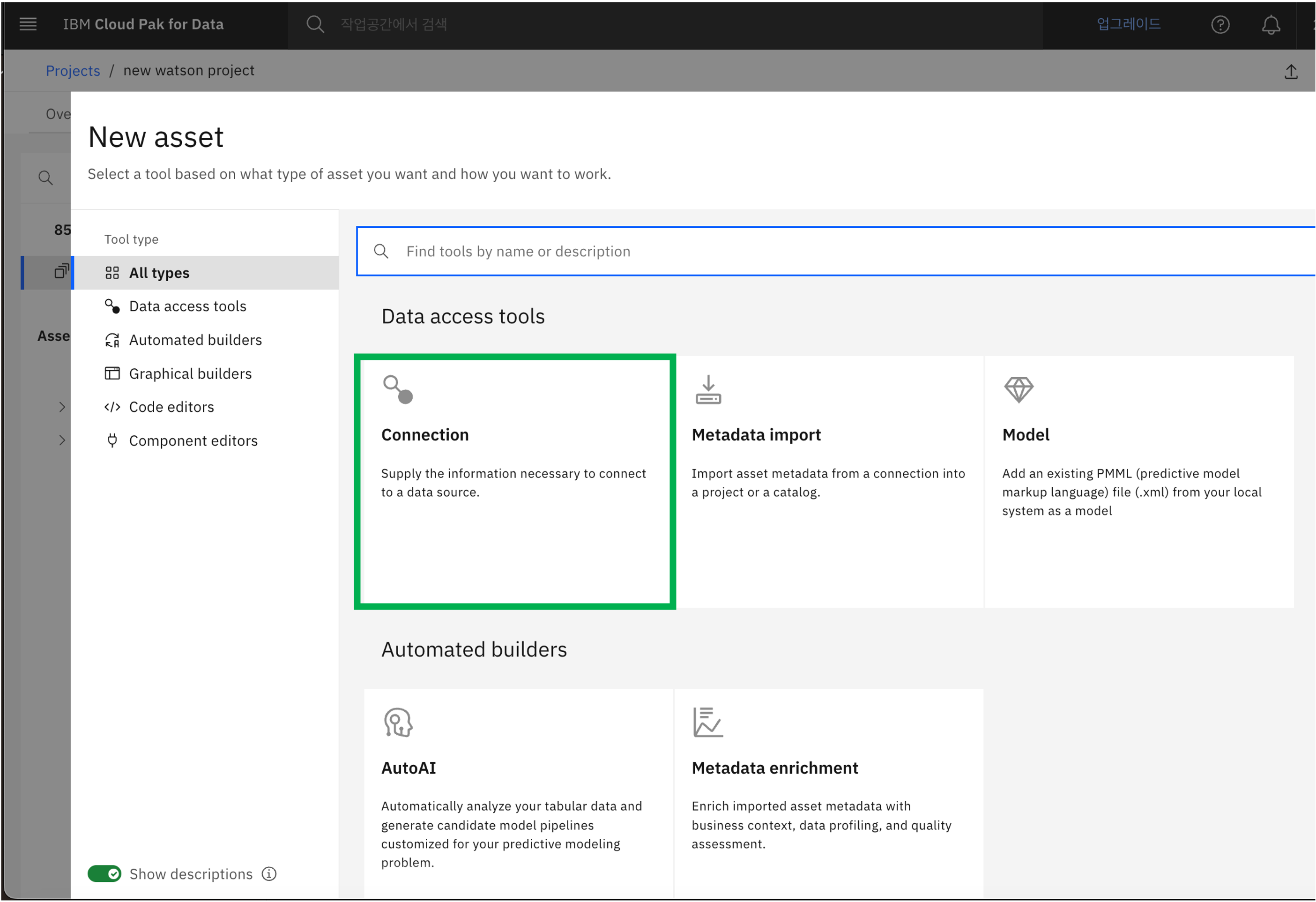 그런 다음, Cloud Pak for Data 에서는 사용자가 만든 항목들을 Asset (자산)이라고 명칭하는데, 데이터를 액세스하기 위한 Asset 으로 Connection asset 을 만들어야 합니다.