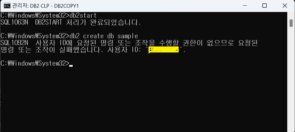 Windows 환경에 Db2 데이터베이스 환경을 구성하는 경우, SQL1092N에러로 데이터베이스 생성을 진행 할 수 없는 경우가 종종 있습니다.