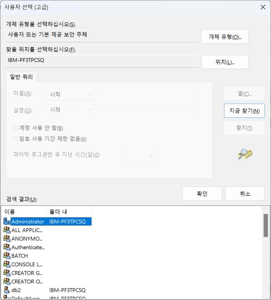 (5) DB2ADMNS 그룹에 추가할 도메인 사용자 ID 를 선택한 후, 확인을 누릅니다.