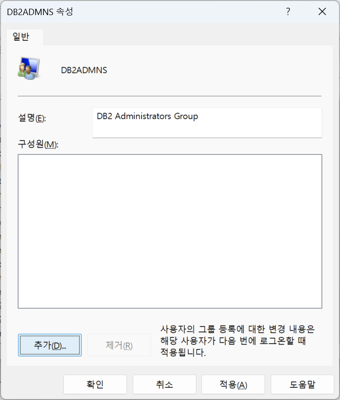 (2) 그룹을 클릭한 후, 'DB2ADMNS' 를 선택하고. 속성 창이 나타나면 추가'를 선택합니다.