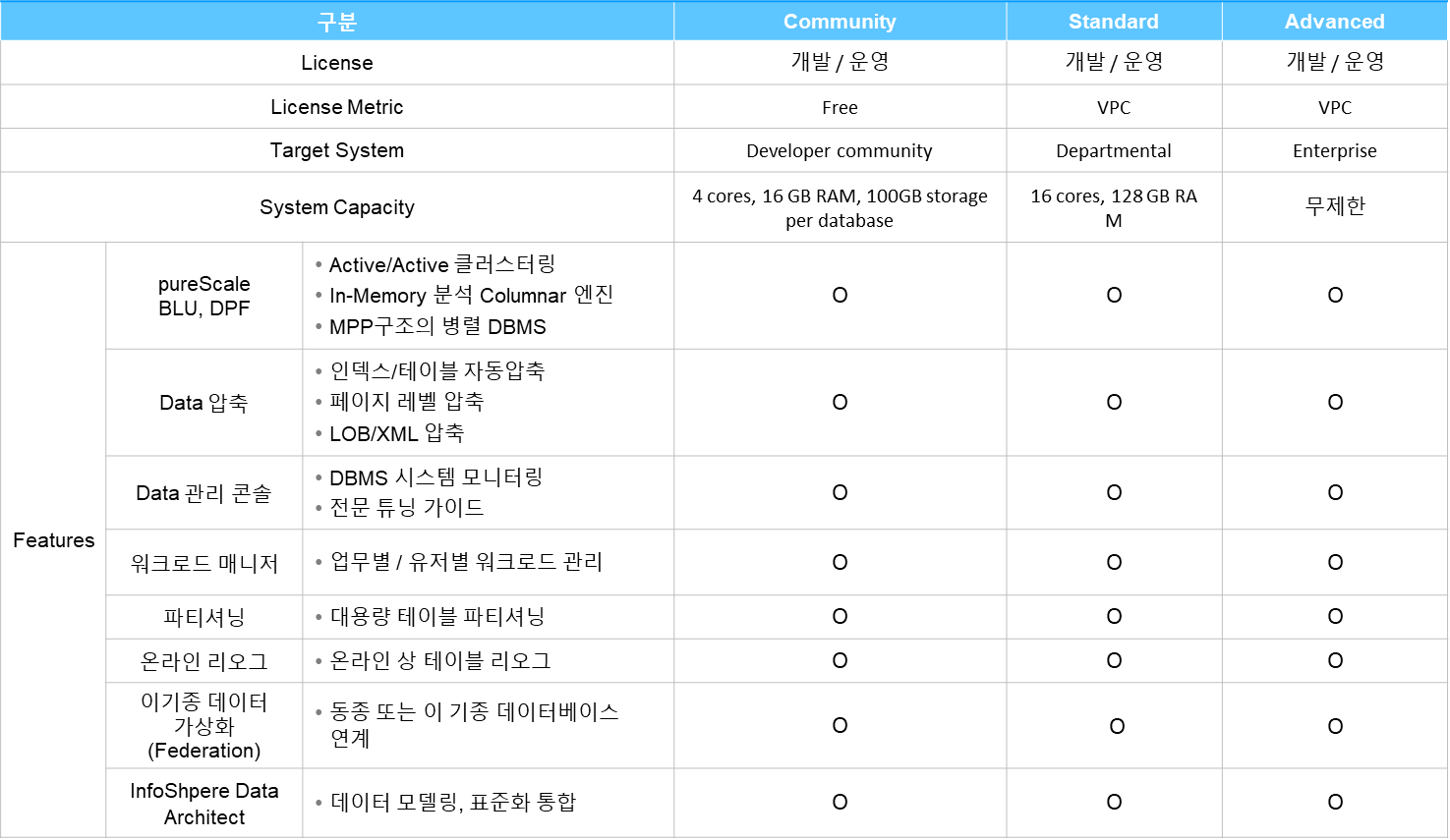 최근의 11.5 버전은 이전과 다르게 라이센스 체계가 대폭 단순화되었으며, 라이센스와 무관하게 모든 기능을 공통으로 지원하고 있답니다! 이전에는 데이터 압축, pureScale, DPF, Workload Manager, 이기종 데이터 가상화 등의 기능을 사용하려면 Advanced 에디션만 가능했지만, 이제부터는 DB서버의 용량에 따라 라이센스를 선택하고 원하는 기능을 사용하면 됩니다.